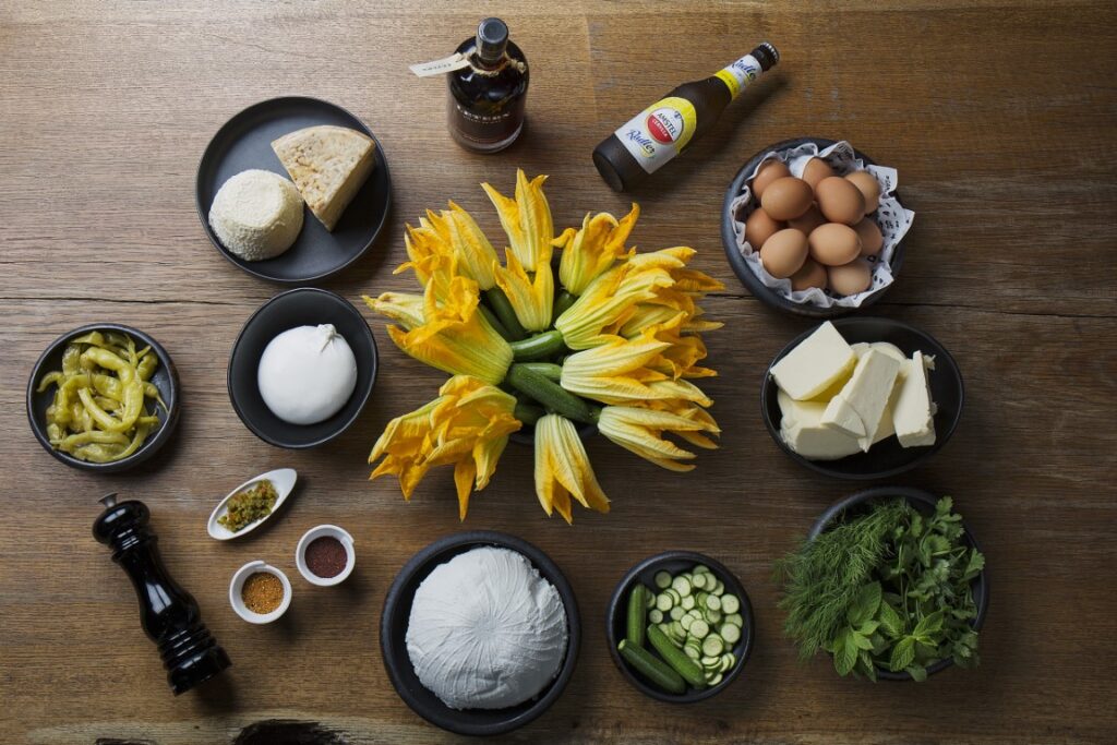 Su tono cítrico resalta el sabor concentrado del calabacín en flor y encuentra un curioso contrapunto en lo lácteo de la mezcla de quesos así como en los toques herbales del aliño que propone Camarena.